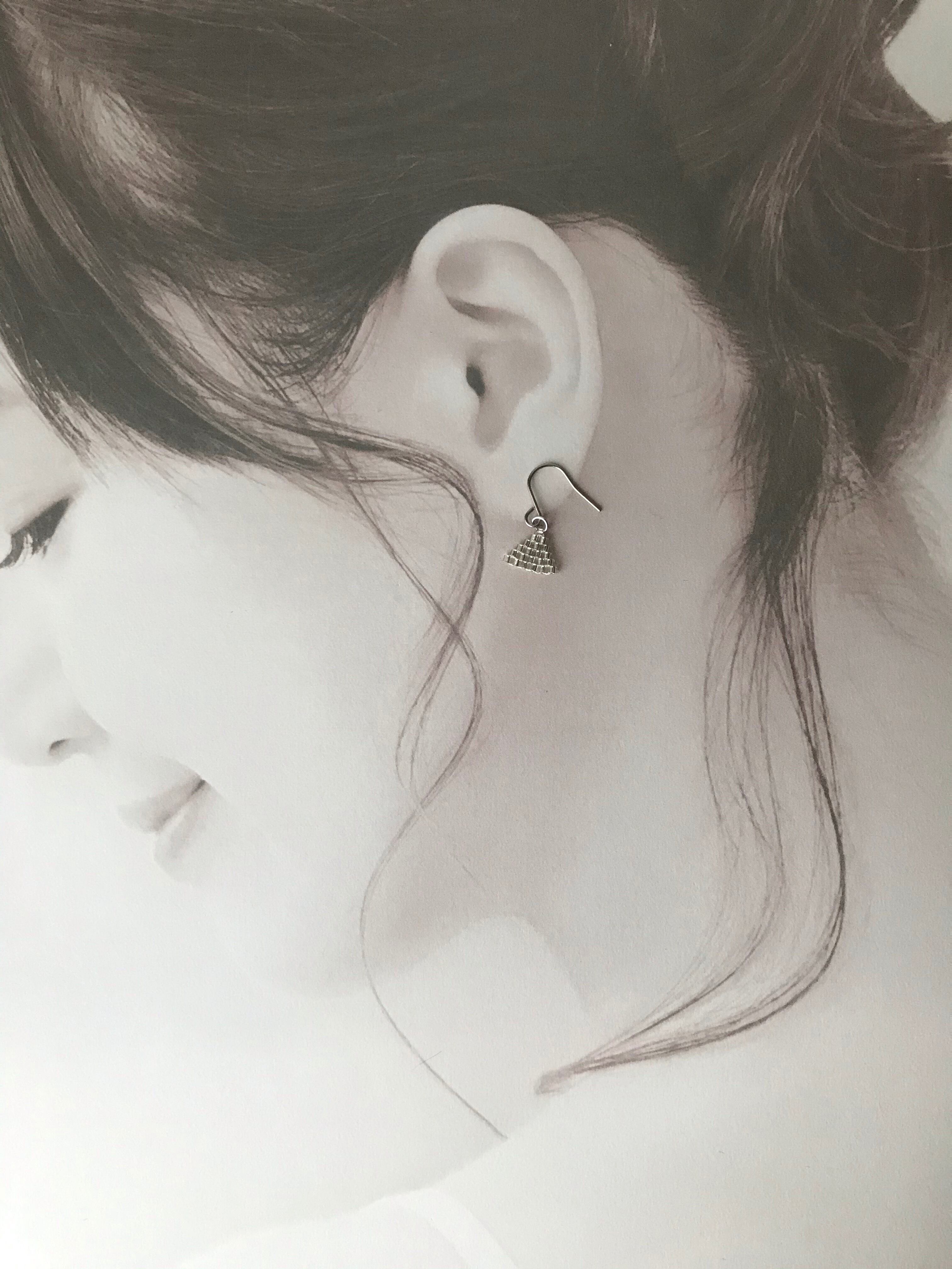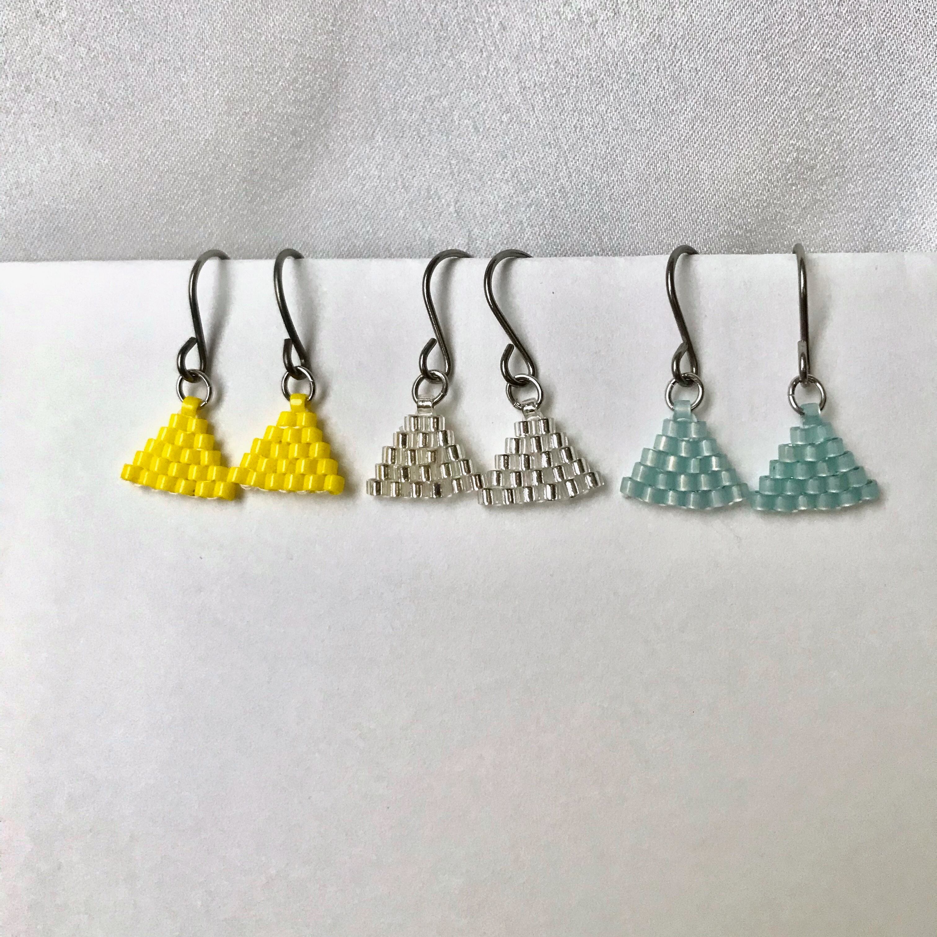ていねいにビーズで編まれた小さな三角モチーフのかわいらしい。耳元で小さく揺れるのがポイントです。