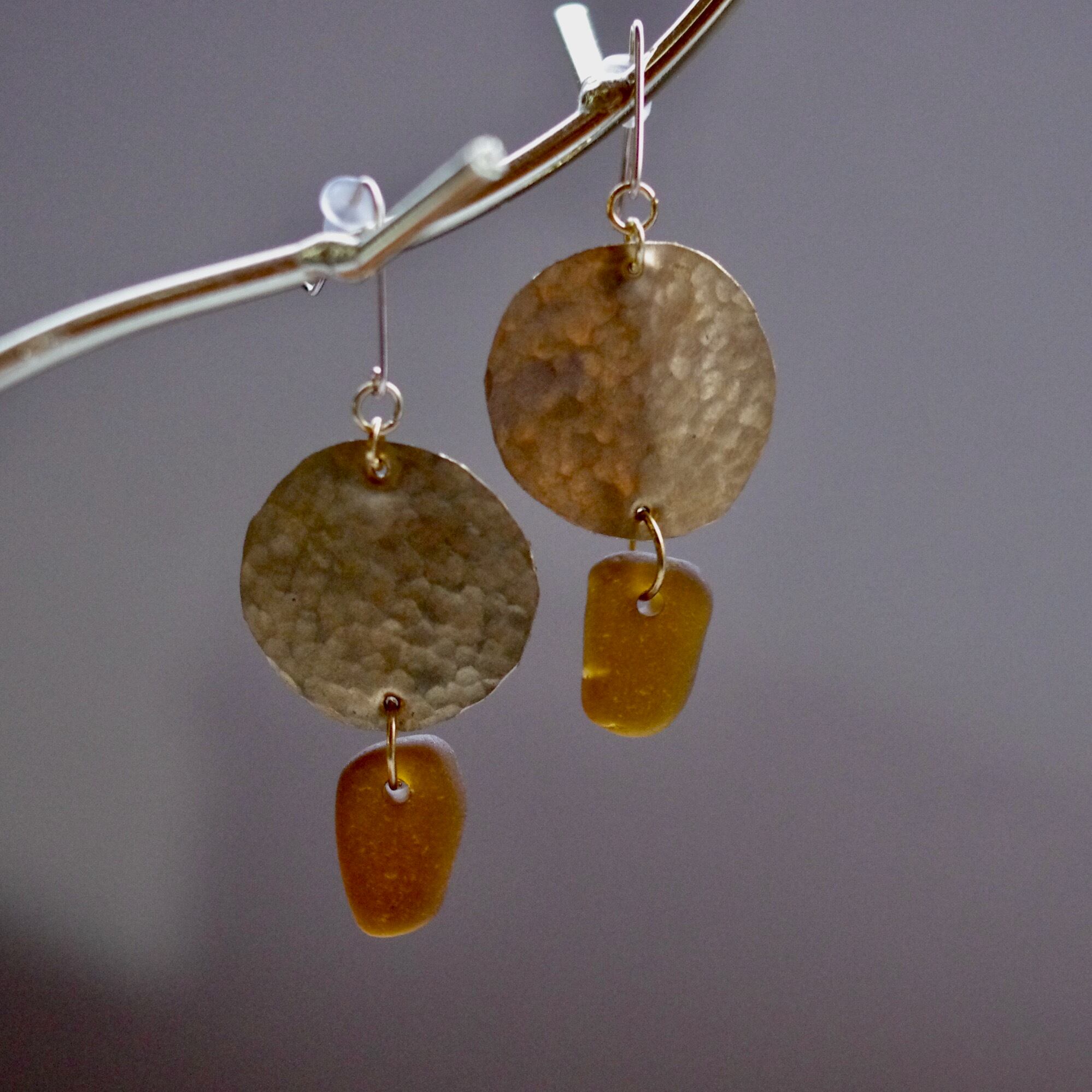 漂着ガラスのピアス・イヤリング「Full moon」(ブラウン)/UMIUMI