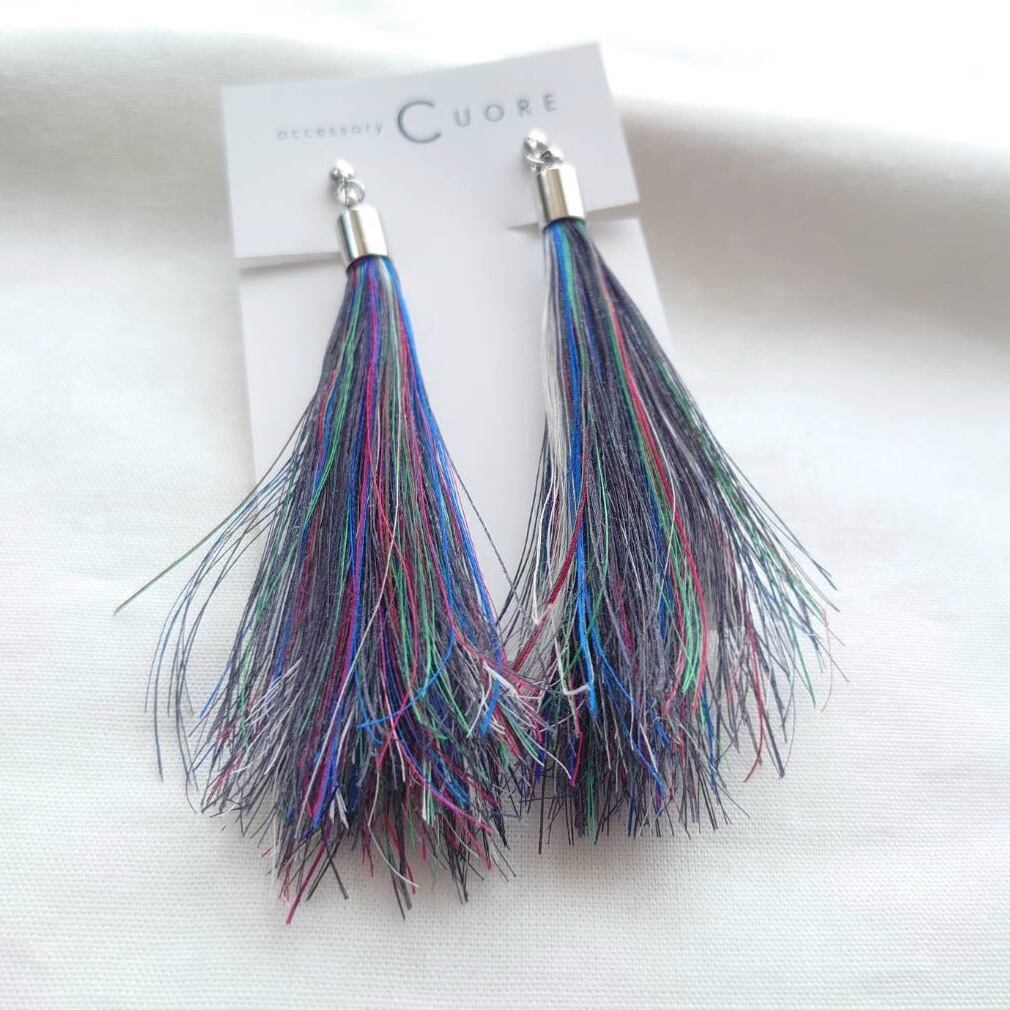 落ち着いたグレーの雰囲気でありながら、赤、青、緑とカラフルな色合いを楽しめる、播州織タテ糸をタッセルデザインにしたイヤリング。