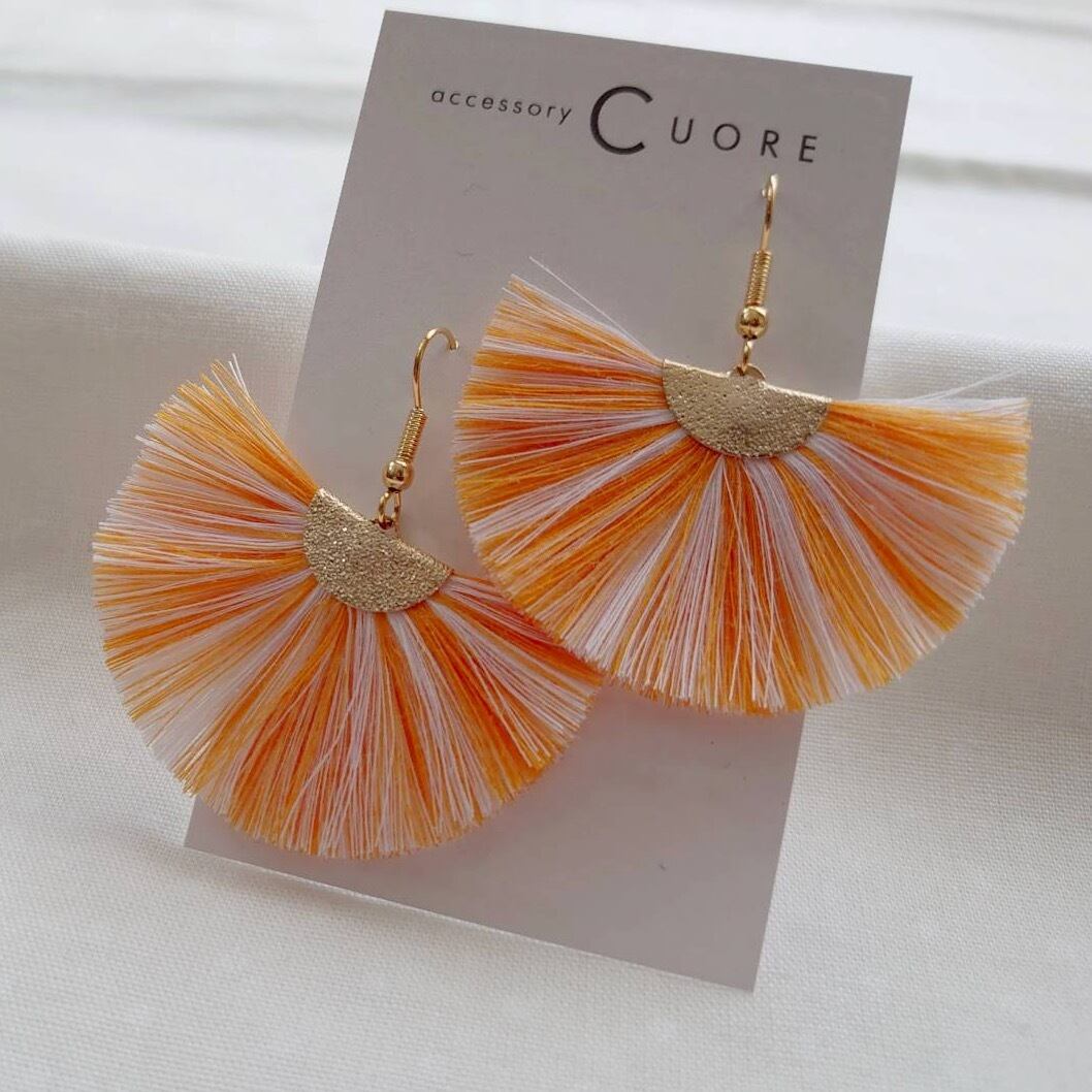 夏らしい明るいオレンジとホワイトがミックスされた、品のある扇型のピアス。
