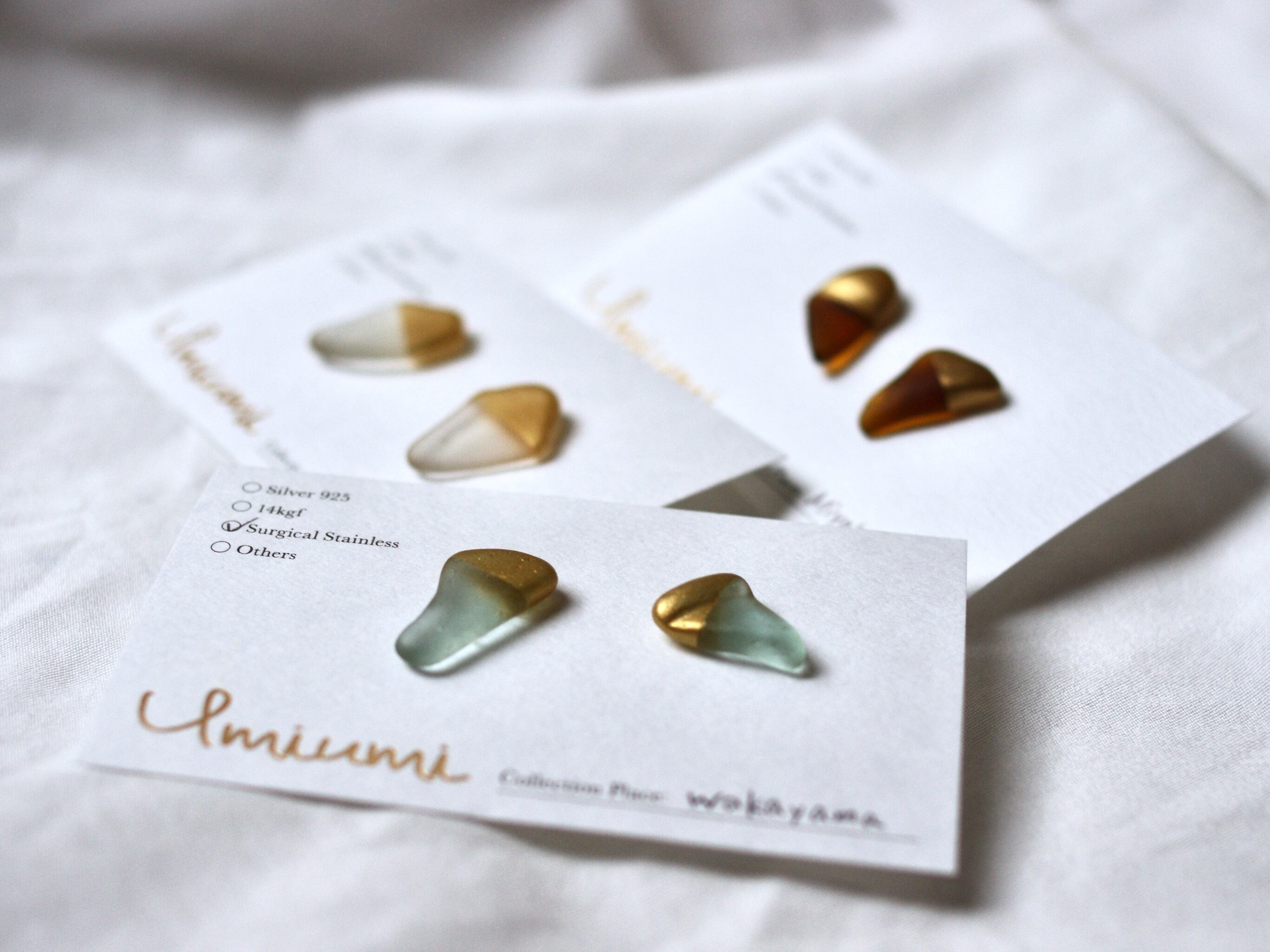 素 材:モチーフ部分…宮古島で収集したシーグラス(漂着ガラス)・金塗装、ピアスポスト…サージカルステンレス