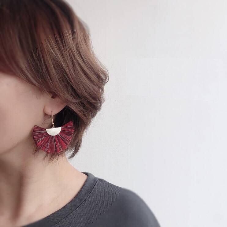 秋らしいこっくりとしたグラデーションにオレンジのアクセントを楽しめる扇型ピアス。中央のボタンみたいなパーツが程よいアクセントに。