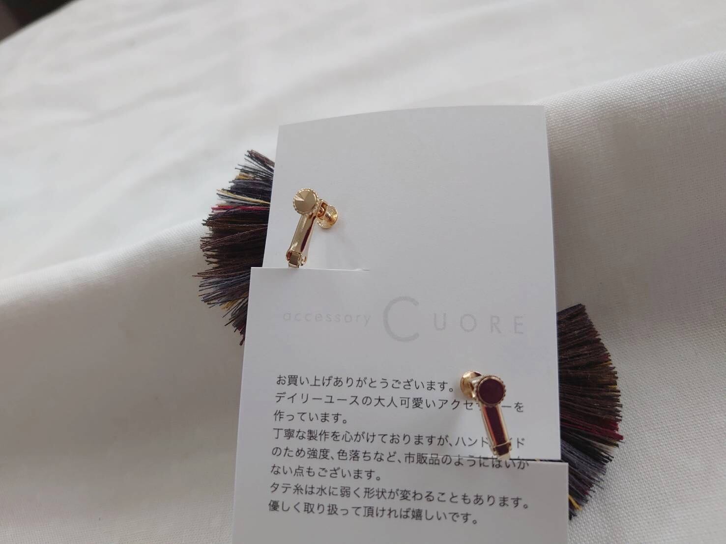 素 材:モチーフ部分…播州織タテ糸(綿)、留部材…本革(廃材)、イヤリング金具…真鍮