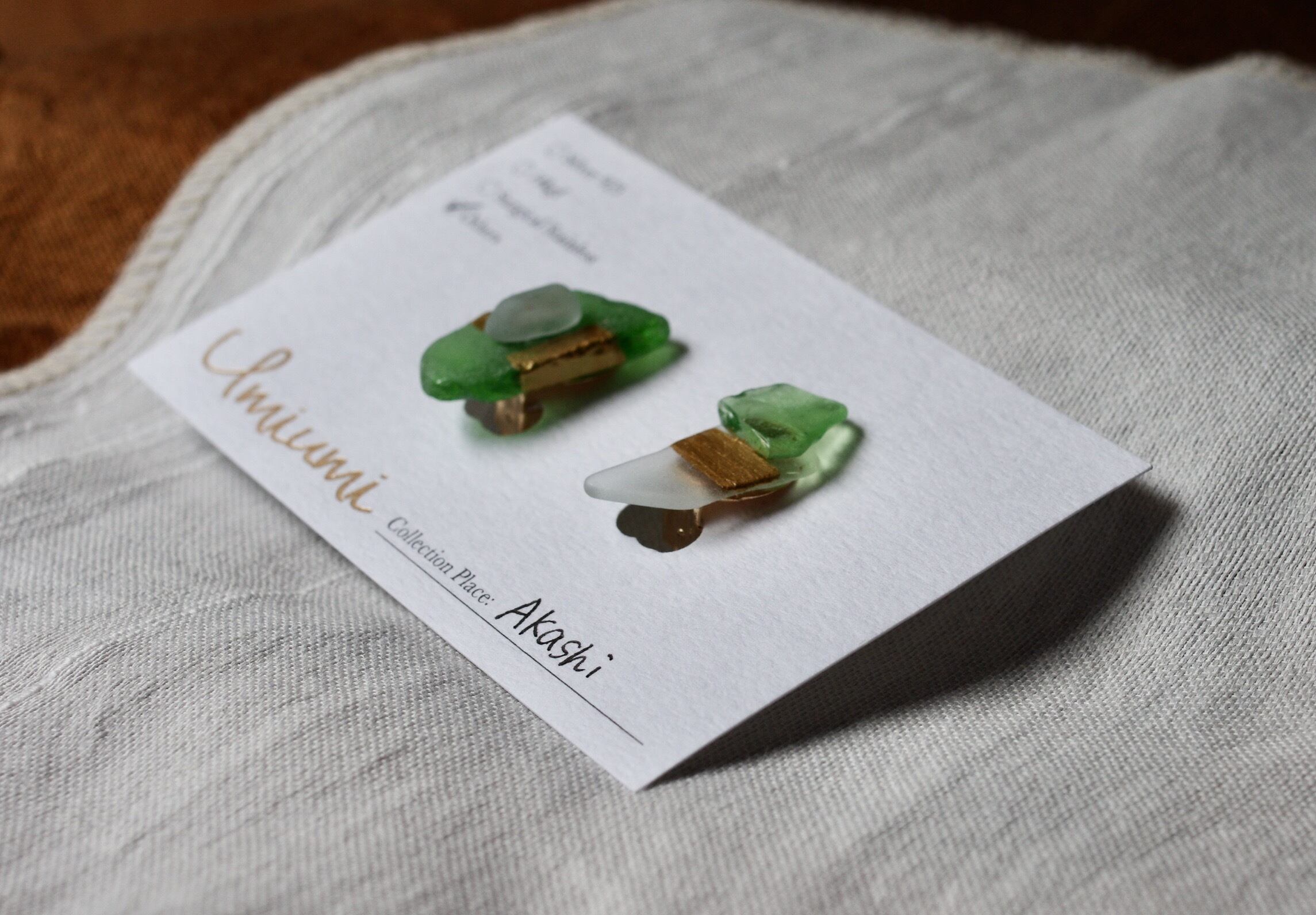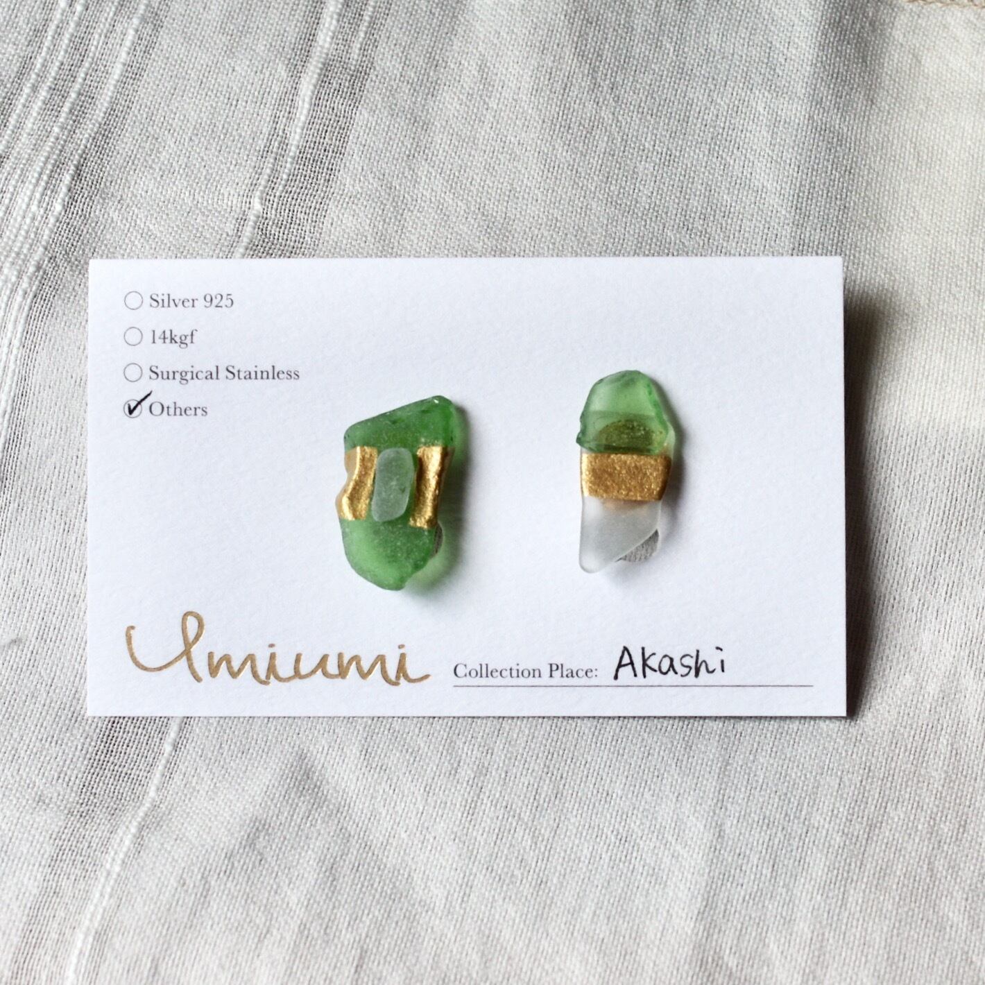 こちらは、メルとモノサシ店主が地元・明石の林崎松江海岸で拾ったシーグラスや陶器のかけらを、UMIUMIのデザイナーさんにお送りし、特別につくっていただきました。白やグリーンの小さなシーグラスを組み合わせたアシンメトリーなデザイン。金のラインがアクセントになっています。