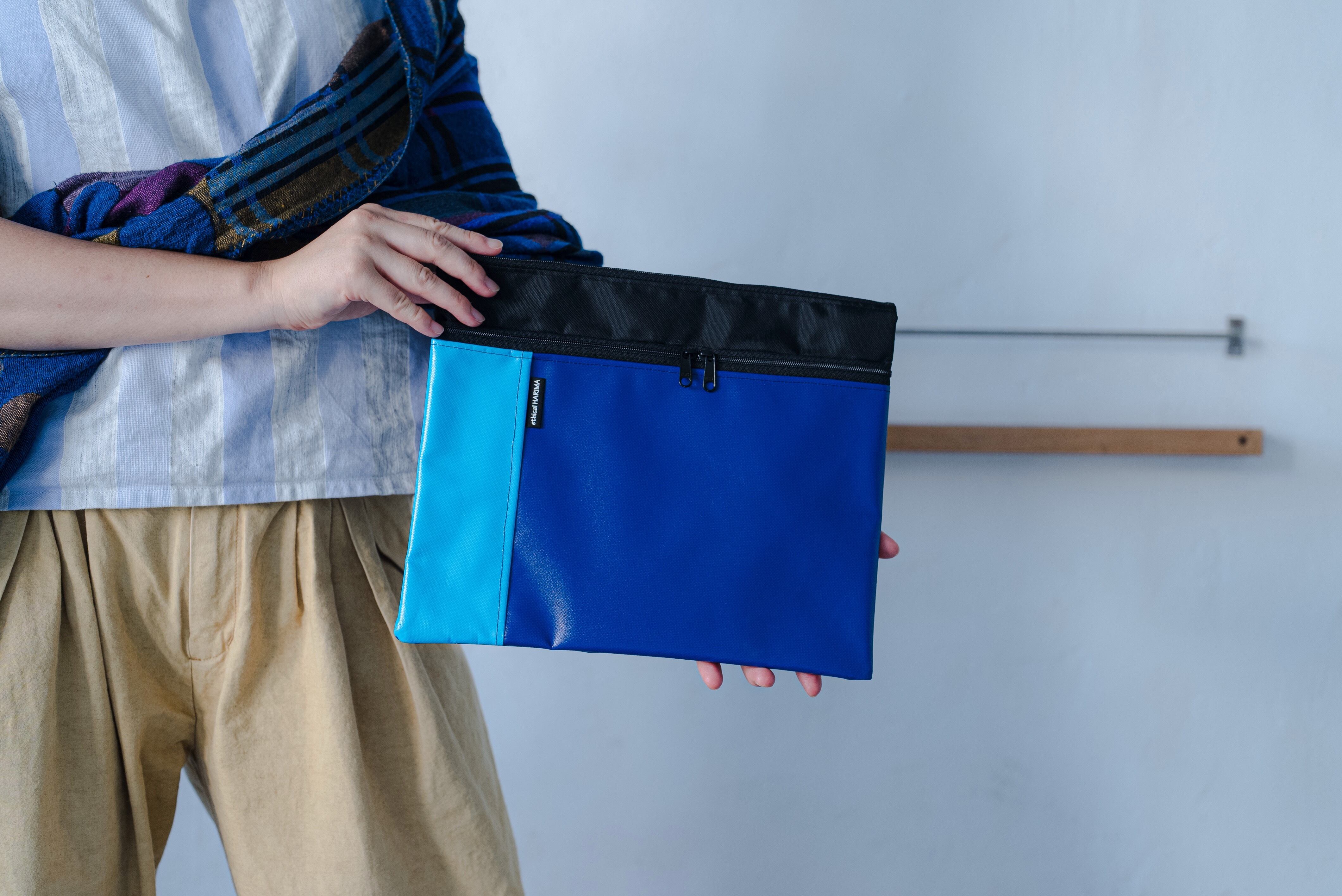 捨てられる予定だったテント用生地の在庫を活用し、1点1点ていねいにつくられたクラッチバッグ。2箇所のファスナー収納があるので仕分けもしやすく、財布、スマホ、鍵など貴重品がちょうど入りきるいいサイズ感。テント生地は軽くて汚れも拭き取れるので大きめのコスメポーチにも使いやすそう。