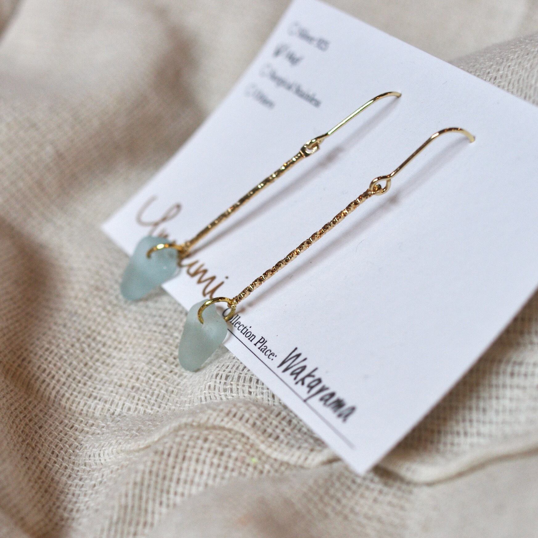 海岸でデザイナーが収集したガラスの欠片でつくった、耳元で揺れるタイプのピアス。何十年もの間漂流し、角の取れた小さくて可愛いブルーのシーグラスと、光のもとできらりと光ゴールド色のチェーンンの組み合わせがとても上品な雰囲気です。肌に優しい14金のピアス金具を採用しています。