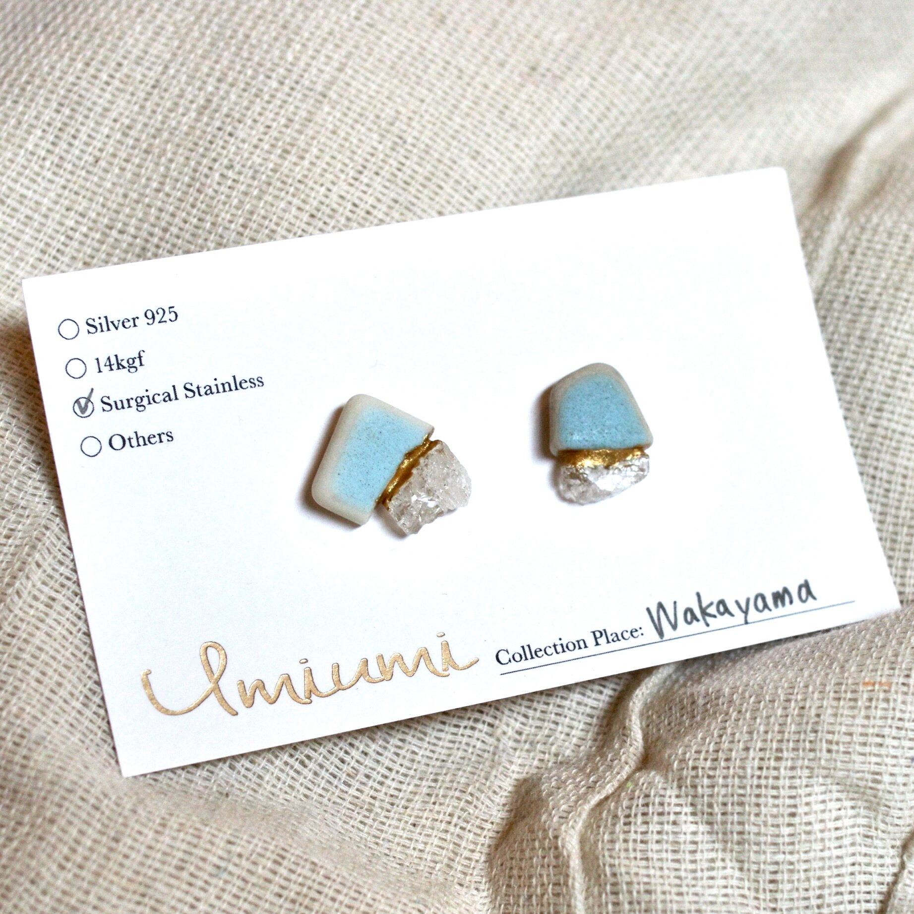 海辺に漂着した陶器の欠片×沖縄・琉球ガラスの破片の金継ぎピアス(ブルー×ホワイト)/UMIUMI