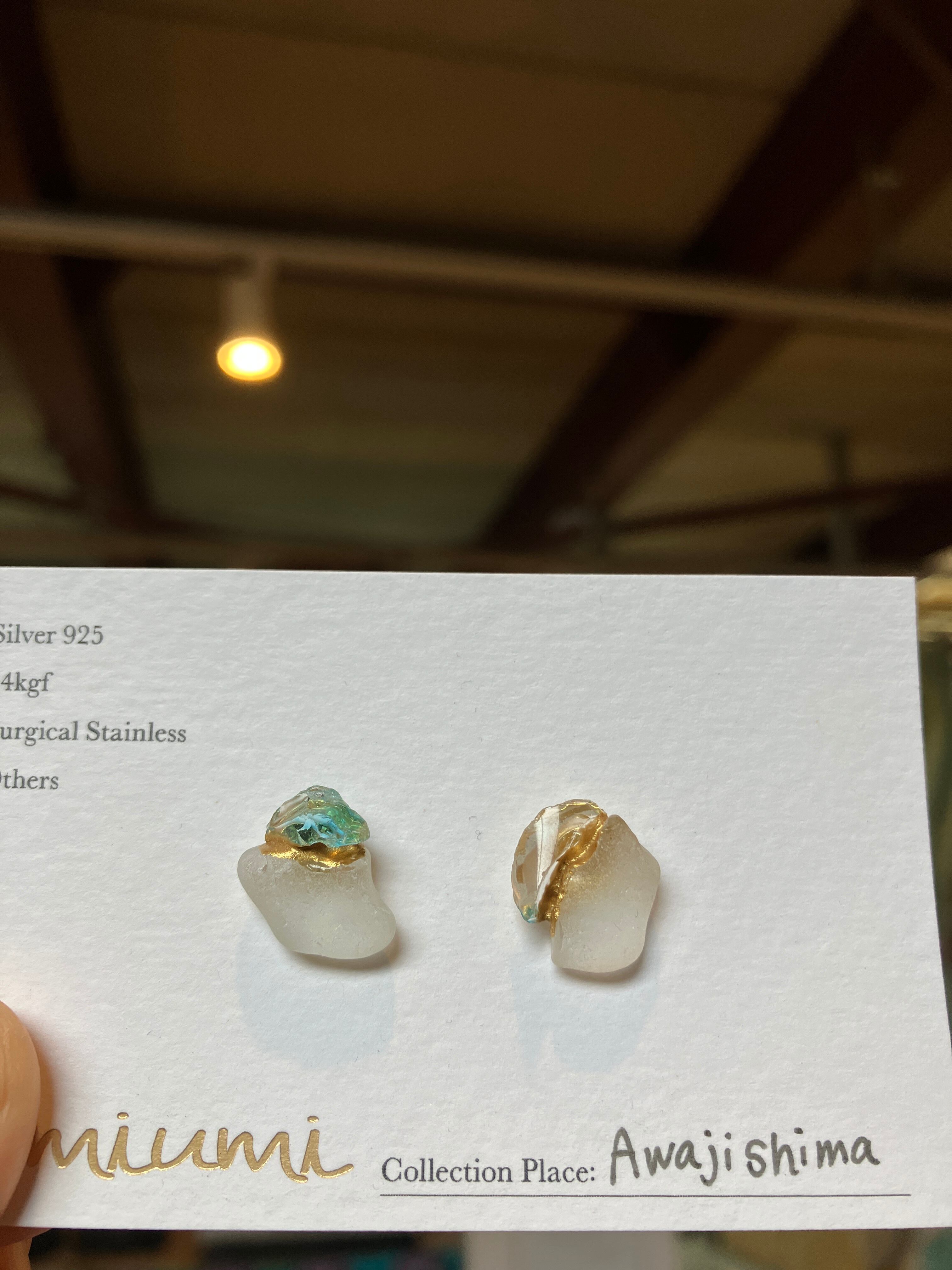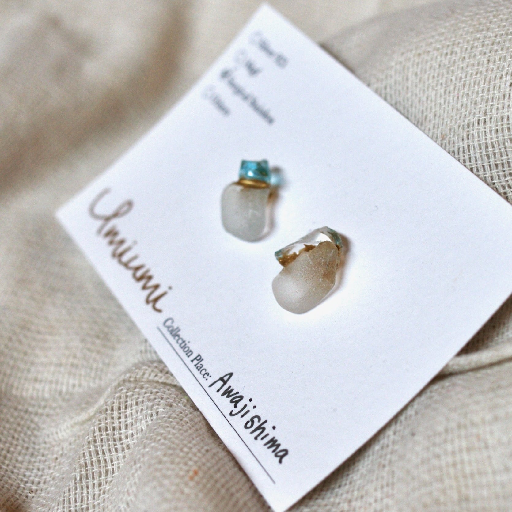 海岸でデザイナーが収集したガラスの欠片と、沖縄の琉球ガラスの工房から譲り受けたガラスの破片を金継ぎで組み合わせた、透け感や爽やかな色合いを楽しめるピアス。