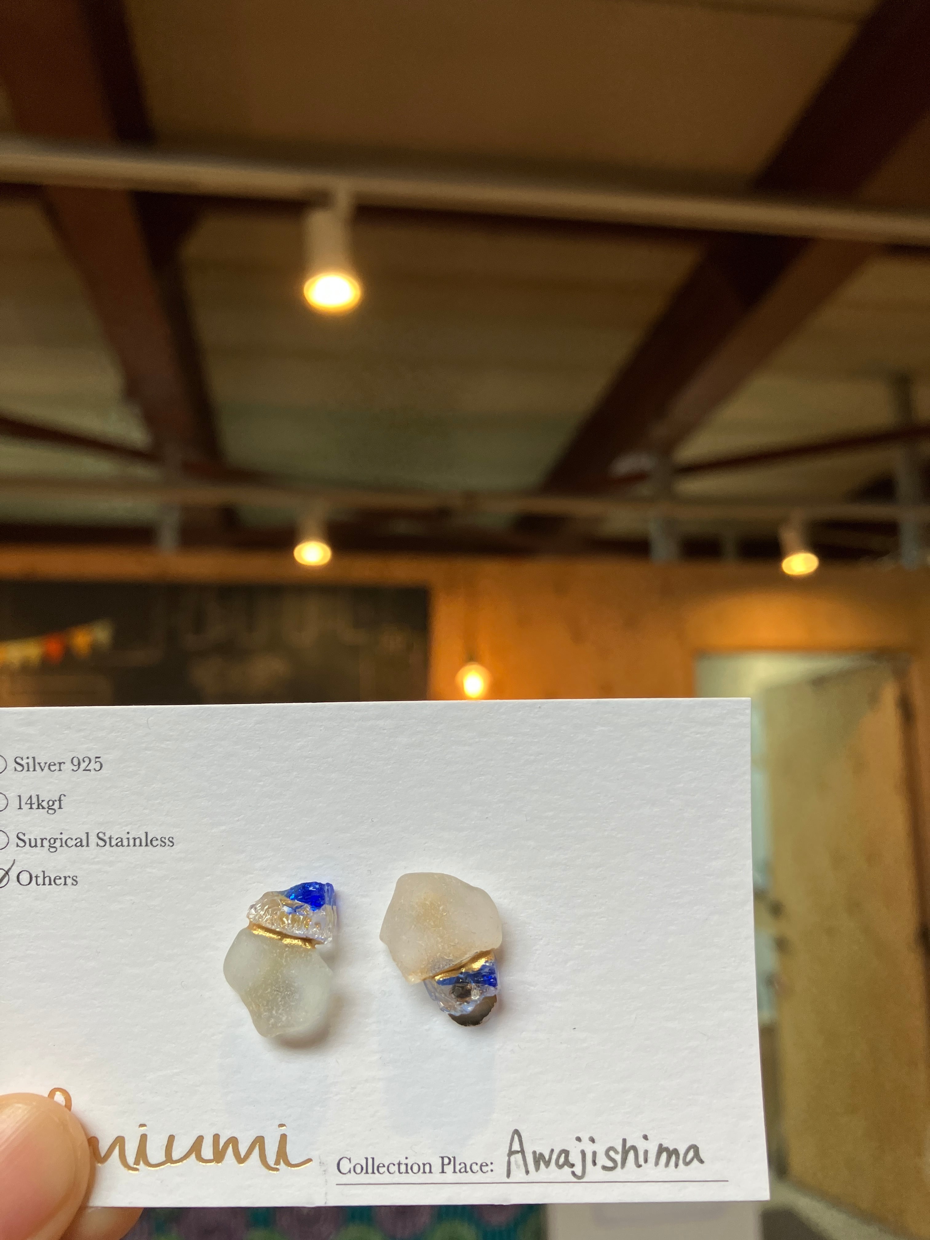 ・素 材:モチーフ:海岸で収集したガラスの欠片、琉球ガラスの破片、金継ぎ、イヤリング金具:真鍮