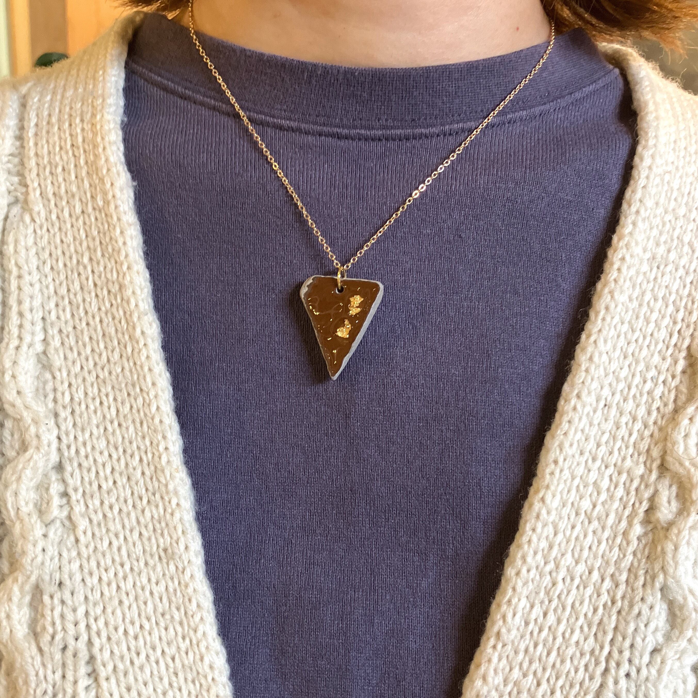 当店のお客様から譲っていただいた、兵庫県・赤穂の海岸で拾い集めた陶器のカケラに金箔をトッピング。表裏どちらでも使える素敵なペンダントになりました。